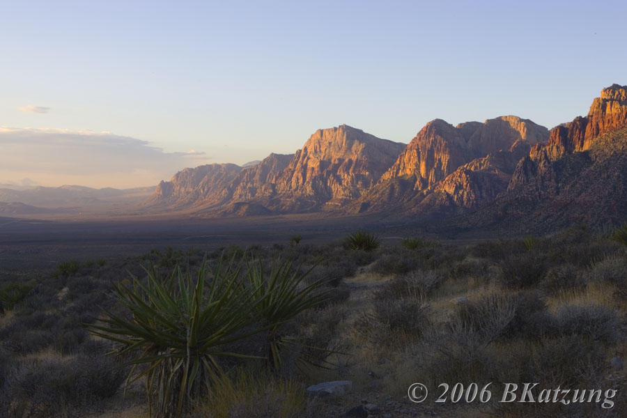 Red Rock Canyon State Park, Nevada There seem to be several parks with this name (because red sandstone is a very common geologic feature in the area), so I specify that this is the park near Las Vegas, NV. I visited a few minutes after sunrise but got some sunrise-type light because the sun was trying to break through some clouds in the east. 1