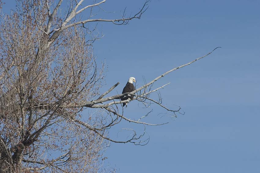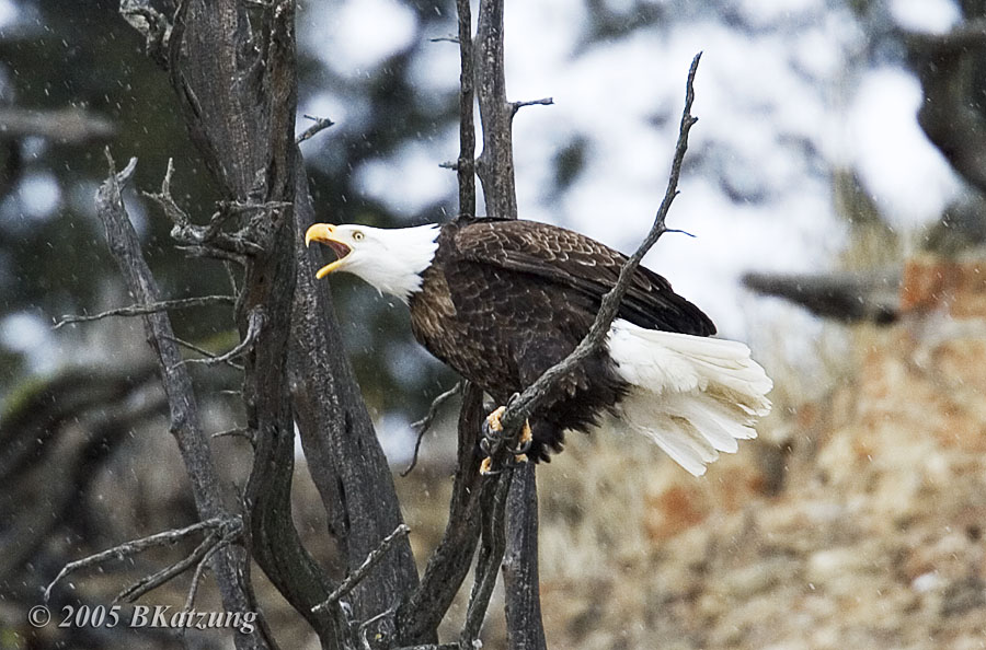Below: another eagle, leaving an elk carcass and flying over to a snag (downed tree).