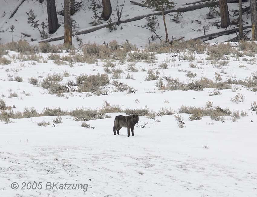 The above image was taken in a snowstorm. An elk carcass lies in the gulley at the right. The wolves are members of the Slough Creek Pack, 2005. Note ravens in the middle tree and on the ground.