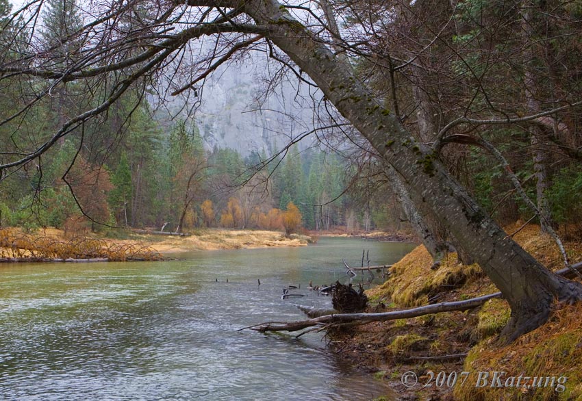 Below, the Merced River in Yosemite Valley looking more like fall than winter. The winter of 2006-07 has been very dry so far and warmer than average except for a few weeks.