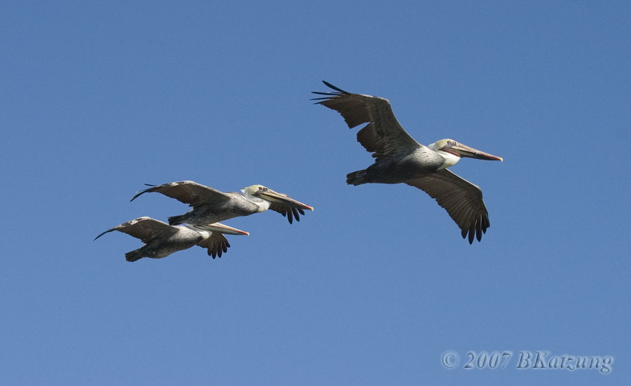 Brown Pelicans at Elkhorn Slough Brown pelicans are far more numerous than the larger white pelicans at Elkhorn. We saw only a few feeding, since the tours took place between 9AM and 12 and between 2 and 4PM, whereas prime feeding times are earlier in the AM and later in the PM when the fish are closer to the surface. Nevertheless, some of the pelicans spent a lot of time flying around, so we got many flight shots.