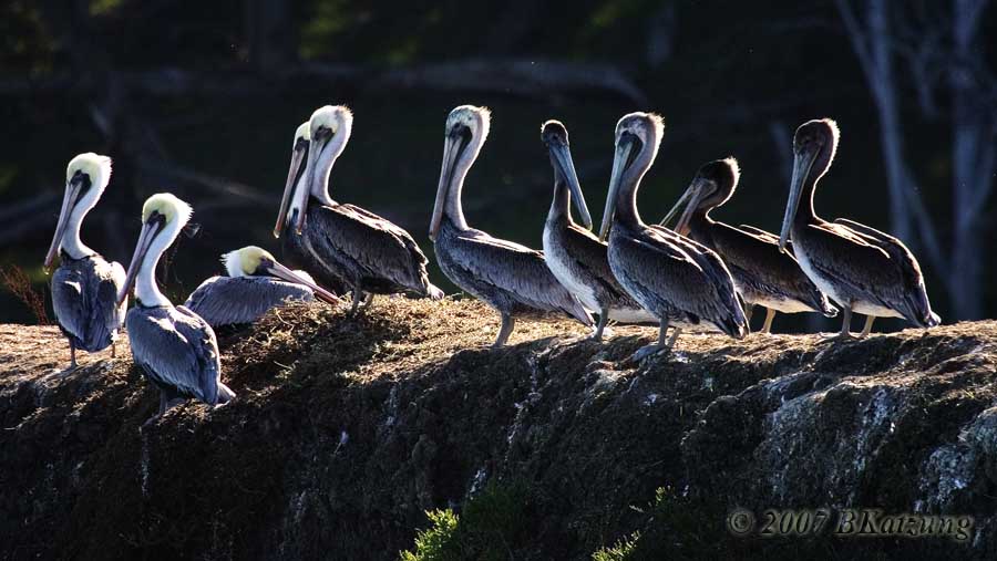 Below: A line-up of backlit pelicans.