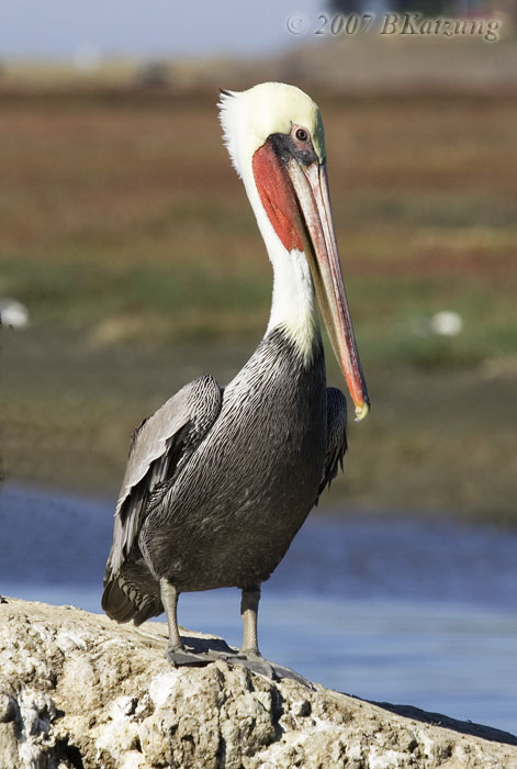 Below, three pelicans. The middle one, with the red gular pouch under his beak, is a male getting his breeding colors.