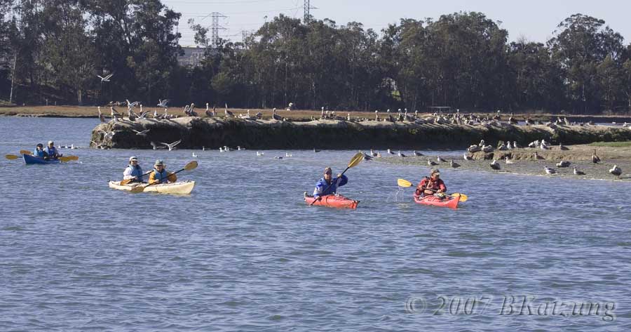 Below a few kayakers out on the slough for a close look at some of the wildlife. Mostly pelicans and gulls observing them from the shore.