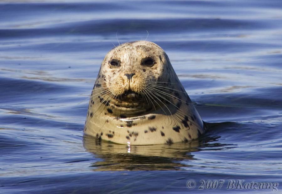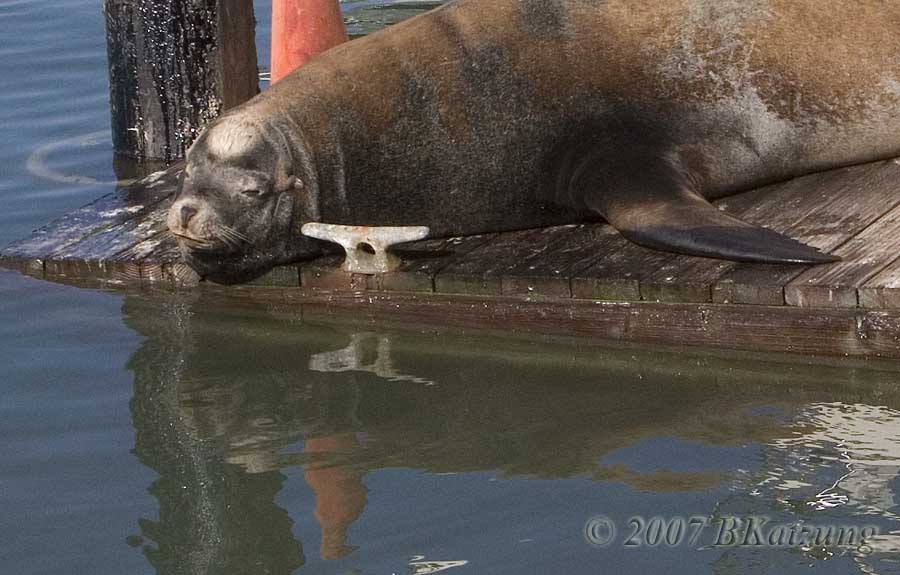 Sea Lions and Harbor Seals There were quite a few sea lions and harbor seals in the Moss Landing harbor. The sea lions kept up a constant raucous barking when congregated in groups, but this lone, older bull, seems to be admiring his reflection in the water. I call him Narcissus.
