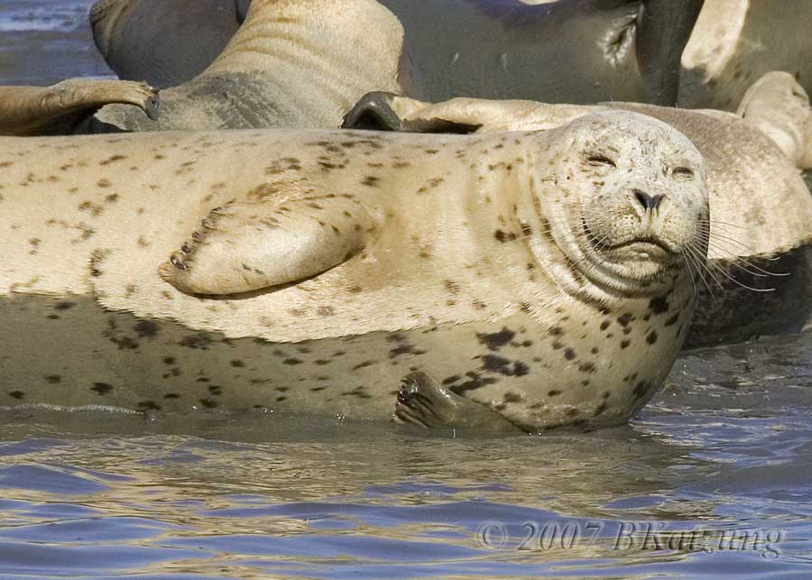 Another sea lion who seems to be scratching his neck with his front flipper. Or maybe it's someone else's foot. Anyway, his tiny external ear is clearly visible here.