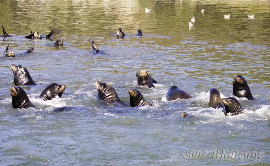 A raft of sea lions churning up the water. The small external ear (one of the distinguishing features of sea lions as opposed to seals) can be seen here and more clearly in the image below this one.