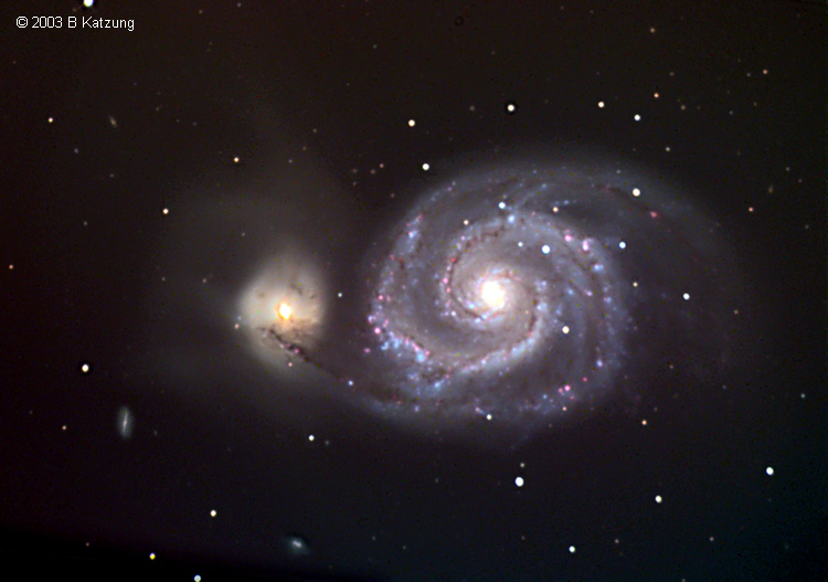 M51 (NGC 5194/5), The Whirlpool Galaxy, in Canes Venatici — CCD Images M51, with its small companion galaxy NGC5195 (left, North), is one of the most famous and certainly one of the most beautiful galaxy pairs in the northern sky. Although about the same size as the Milky Way and the Andromeda galaxy, it is about 37 million ly distant, and therefore quite small. Several knots of reddish hydrogen-rich star-forming regions can be seen in the spiral arms. (Note that much faint "nebulosity" around the smaller galaxy will only be visible on a monitor in a darkened room.) As suggested by the number of images on this page, M51 is a tricky target—it's easy to get an image of it but difficult to get (and process) a good image. North is to the left in these images. Note the two tiny additional galaxies (small smudges) below (about 7 o'clock) and to the left (about 8 o'clock) of the main pair.