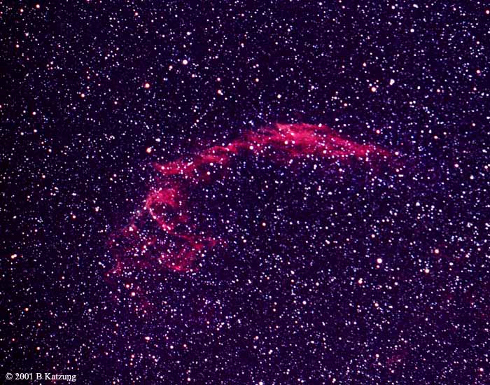 An H-alpha image of the eastern portion of the Veil nebula. Considerable wispy detail can be seen in spite of high clouds that were present.