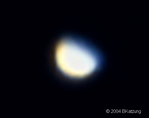 As with my other recent planet images, this image of Venus in gibbous phase was taken with a Philips ToUCam web camera. I used the 640x280 mode, 1/500 second exposure. Venus was rather low on the horizon when the image was taken and there was significant atmospheric color refraction. I partially corrected the offset in Photoshop. A-P 130 mm EDF f/6 refractor with a TeleVue 4x Powermate barlow for a final f/24.