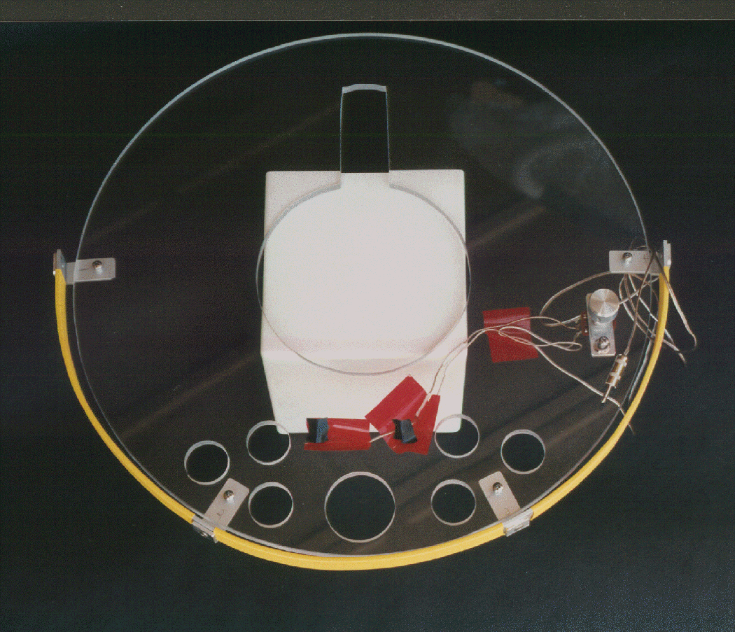 The holder is cut from a piece of 3/8 inch acrylic (Plexiglas). I had the supplier (a local plastic retailer) cut the outer and inner circles. The inner cutout is large enough to fit loosely over the tripod top so the holder is supported by the tops of the legs of the tripod. There is enough space so that the 3/8-thick holder just fits between the tops of the legs and the bottom of the scope or wedge. I then cut the notch in the inner circle to accommodate the wedge azimuth adjuster, and the eyepiece holes. The yellow rim around the front is a piece of 5/8 x 1/8 aluminum with yellow shrink-wrap electrical tubing shrunk tightly onto it. It is held on to the plastic with 4 radially oriented brackets drilled and tapped so that the rim is held about 1/4 inch from the edge of the plastic. The rim is used for hanging the hand control of the scope (you can see the top of the control in the right picture hanging down in front). Two small bulbs (RadioShack) are mounted in the plastic and powered from the 12 volt battery that I also use for powering the scope and dew zappers. These bulbs are located under the black spots (tape) visible in the red spots (also tape) in the left picture. The wires from the bulbs go to a small potentiometer (silver-colored knob at the right side of the holder in the left picture). The pot permits one to adjust the brightness to just enough to make the edges of the eyepiece holes glow in the dark.